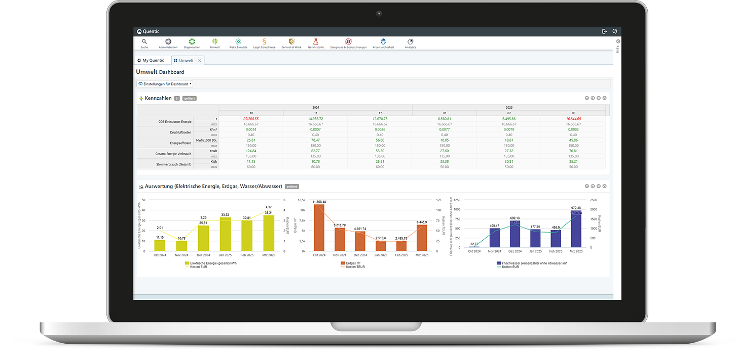 Das Quentic-Modul Umweltmanagement dient der Aufzeichnung und Überwachung sämtlicher Daten zum Ressourceneinsatz. So behalten Sie nicht nur den Verbrauch von Strom, Gas oder Wasser im Blick, sondern erzielen auch für das Energie- und Abfallmanagement beste Resultate.
